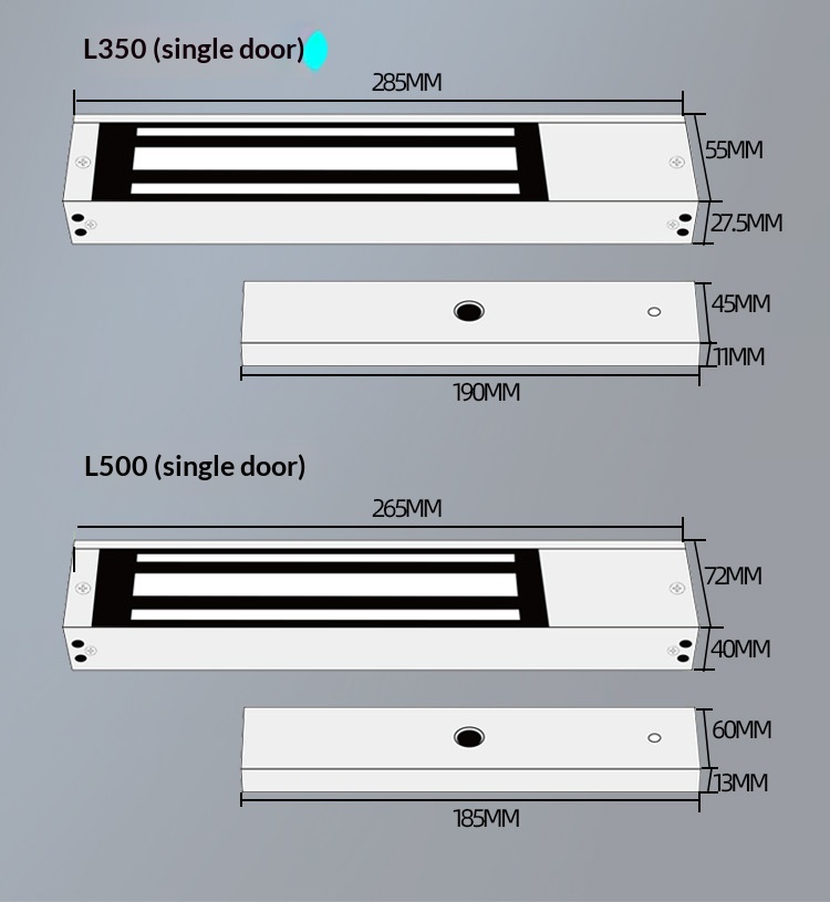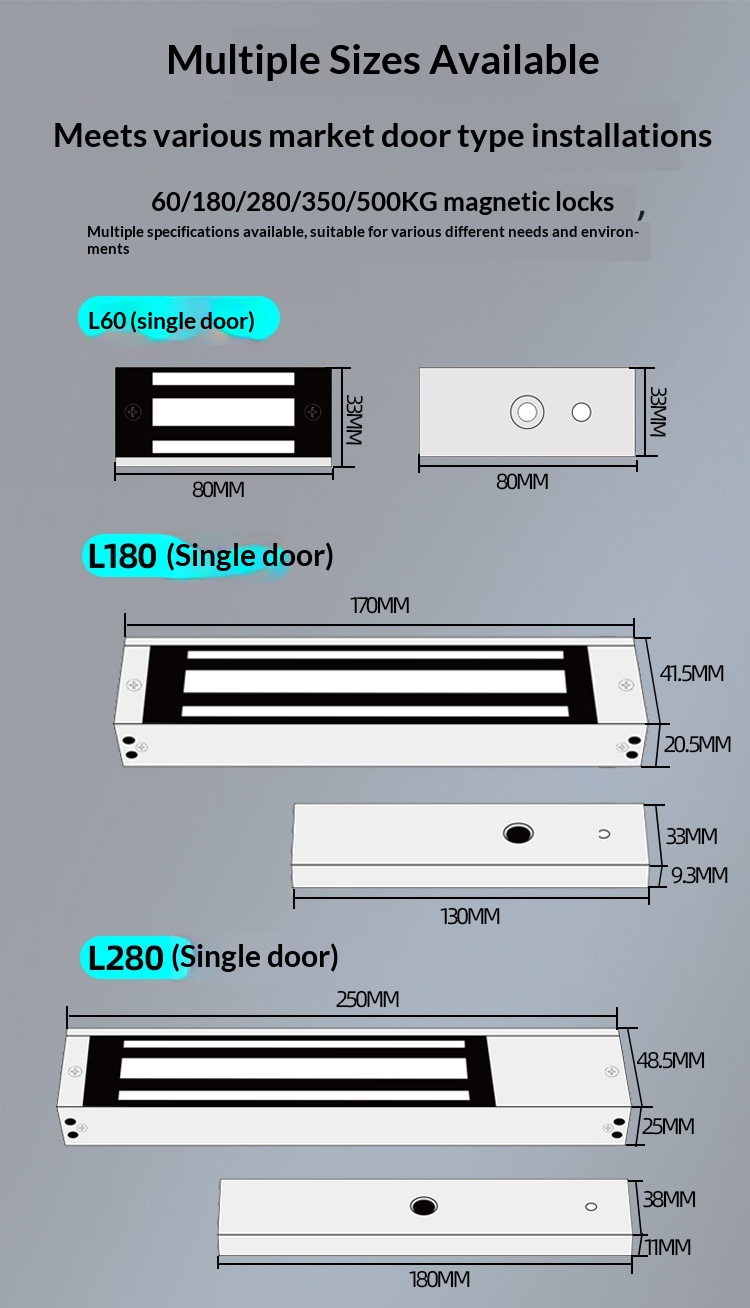 Specifications 60 Kg Surface-mounted Magnetic Lock, 180 Kg Surface-mounted Magnetic Lock, 180 Kg Concealed Magnetic Lock, 280 Kg TT Surface-mounted Magnetic Lock, 280 Kg Concealed Magnetic Lock, 280 Kg Premium Magnetic Lock